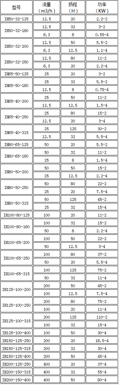 IH型化工離心泵是單級單吸(軸向吸入)懸臂式離心泵,供輸送不含固體顆粒具有腐蝕性、粘度類似水的液體。具有性能范圍廣、效率高、“三化”水平高和維修方便等特點,其效率比F型泵平均提高5%。